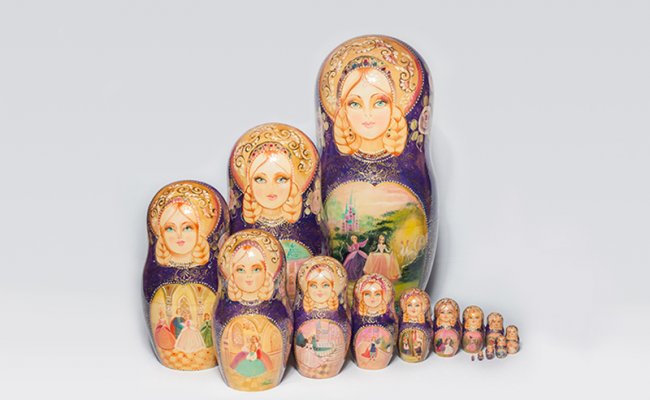 A Matrioshka ( Matrioska ) Exclusiva é uma verdadeira obra de arte. Pintadas a mão uma a uma retratam com uma riqueza de detalhes cenas da vida cotidiana, fábulas, lendas e o folclore da cultura russa. Se cada vestido conta uma pequena história, na cabeça as lindas matrioshkas usam o kokoshnich, um tradicional adereço preso por um arco ou amarrado com fitas.